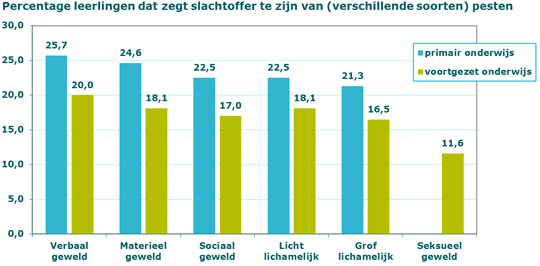 De landelijke monitor Sociale Veiligheid in en rond de school vraagt naar verschillende vormen van agressie en pesten. In de figuur staan de percentages leerlingen in het primair en voortgezet onderwijs die naar eigen zeggen te lijden hebben onder verschillende soorten geweld. Het gaat om cijfers van 2014.